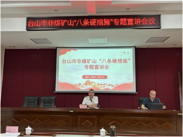 2024年7月31日,台山市应急管理局在组织收听收看广东省矿山“八条硬措施”专题宣讲视频会议后,召开本市推进非煤矿山企业“八条硬措施”专题宣讲会议,会议传达台山市落实《国务院安全生产委员会关于防范遏制矿山领域重特大生产安全事故的硬措施》任务分工方案相关精神,对我市非煤矿山行业安全生产形势进行了研判分析,部署非煤矿山企业下阶段责任任务,矿山和危化监管股、各矿山企业主要负责人及安全管理人员共24人参加此次会议。