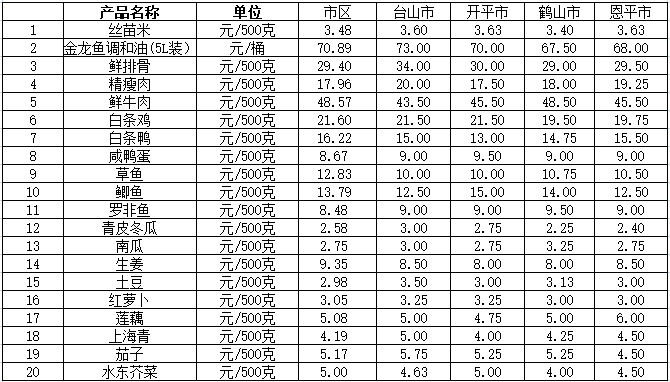 说明:1、表中价格为该地区监测点上周综合平均价;2、“市区”含蓬江区、江海区、新会区,价格分别采自蓬江市场、江南市场、城东市场等13家农贸市场;3、其他四个县市价格分别采自新华市场、锦江市场等8家农贸市场。