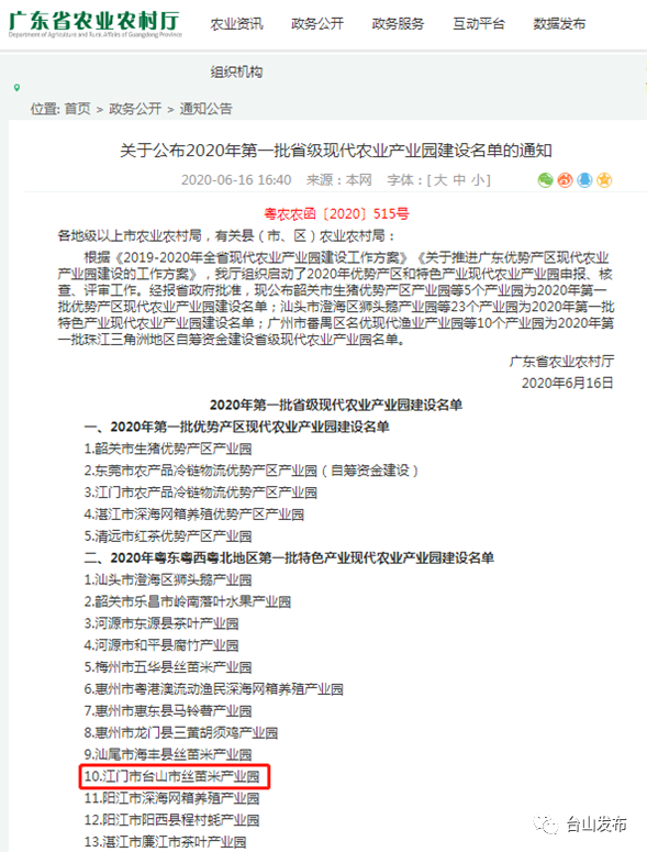 近日,广东省农业农村厅公布了2020年第一批省级现代农业产业园建设名单,台山市丝苗米产业园入选2020年粤东粤西粤北地区第一批特色产业现代农业产业园建设名单。
