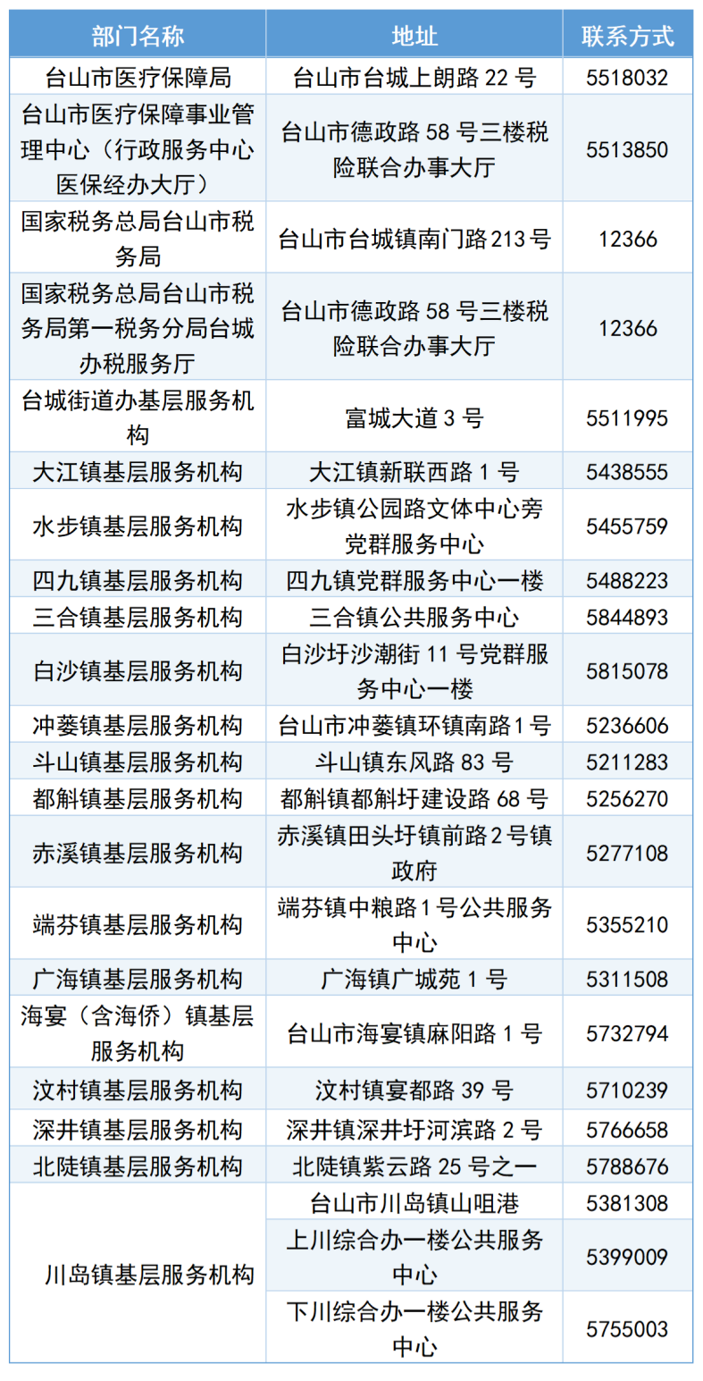 “城乡居民医保参保登记”办理渠道。线上办理路径:扫描“粤医保”小程序登录后即可直接进入城乡居民参保登记办事界面。线下办理路径:参保人可持有效身份证件(如居民身份证、居民户口簿、居住证等)就近到各级医保经办机构及医保经办服务点(如公共服务中心)的医保服务窗口办理参保登记。委托他人办理的还需提供代办人身份证。参保人还可通过“粤智助”自助服务终端的“我要申请参加城乡居民医保”(或“医保”版块的“城乡居民参保登记”)功能进行办理。 六、缴费方式 将缴费金额足额存入签约银行卡(存折)待扣;选择此种缴费方式需成功签订城乡居民银税三方(委托)划缴协议(可通过“粤税通”、“粤智助”、税务窗口办理); 通过“广东税务”微信公众号、粤税通或粤省事小程序【城乡居民社保】【城乡居民社保费清缴】,险种选择“城乡居民医疗保险”线上自助缴费;其中,与家人绑定职工医保个人账户家庭共济关系后,职工医保个人账户的钱可以线上给家人缴纳城乡居民医保。可点击以下链接了解如何代家人缴费:医保账户共济使用!职工医保个人账户的钱可以线上给家人缴纳城乡居民医保! 前往办税大厅缴费或使用粤智助政府服务自助机(全市317个行政村均配备粤智助政府服务自助机)办理费用清缴。 以上为“粤医保”和“粤税通”微信小程序 为确保您和您家人2026年度台山市城乡居民医保参保缴费顺利进行保障好您的医保权益请及时确认以下信息: 若参保人因就业等原因不参加下一年度的居民医保,应在2026年度居民医保扣费前办理“居民医保停保”手续。参保人可通过“粤医保”微信小程序-我要办事-居民医保停保(可代他人停保)办理。 原已办理我市城乡居民医保登记的参保人,未及时申报的,将按缴费标准由税务部门进行划扣。参保人在居民医保待遇享受期(即2026年1月1日)开始后,暂停我市居民医保参保关系的,个人缴费不再退回。 二、确认医保登记的个人信息是否完整、准确? 参保人可登录“粤医保”微信小程序-我的-个人基本信息查看个人基本信息是否确认无误。建议广大参保人将联系方式修改为本人正常使用的手机号码,以便联系及接收短信,若未成年人或老年人无手机通讯设备,可添加监护人或直系亲属手机号码。 个人信息变更办理途径: 线下办理→持有效身份证件到居民医保参保所在地镇(街)公共服务中心医保经办窗口办理(代办人办理的同时提供代办人有效身份证件)。 线上办理→登录“粤医保”微信小程序-“我要办事”“查看更多”-“业务办理”选择“城乡居民参保信息变更登记”-点击“开始办理”-根据需求选择变更类型,填写变更后的最新信息,点击提交即可。 三、确认使用银行账户扣费的,“三方协议”是否生效? 参保人可通过“粤税通”微信小程序-城乡居民社保-委托扣费签约-查询协议。若参保人需变更扣费银行账户或发现协议签约失败,需尽快办理重新绑定,避免银行账户划扣失败。(具体操作如下:城乡居民如何通过“粤税通”签订社保费扣款协议)。同时要确保银行账户处于正常交易状态,避免因长期未使用导致冻结、锁定等无法划扣参保费用的情形。 台山市城乡居民医保参保缴费相关部门联系方式 来源:台山市医疗保障局