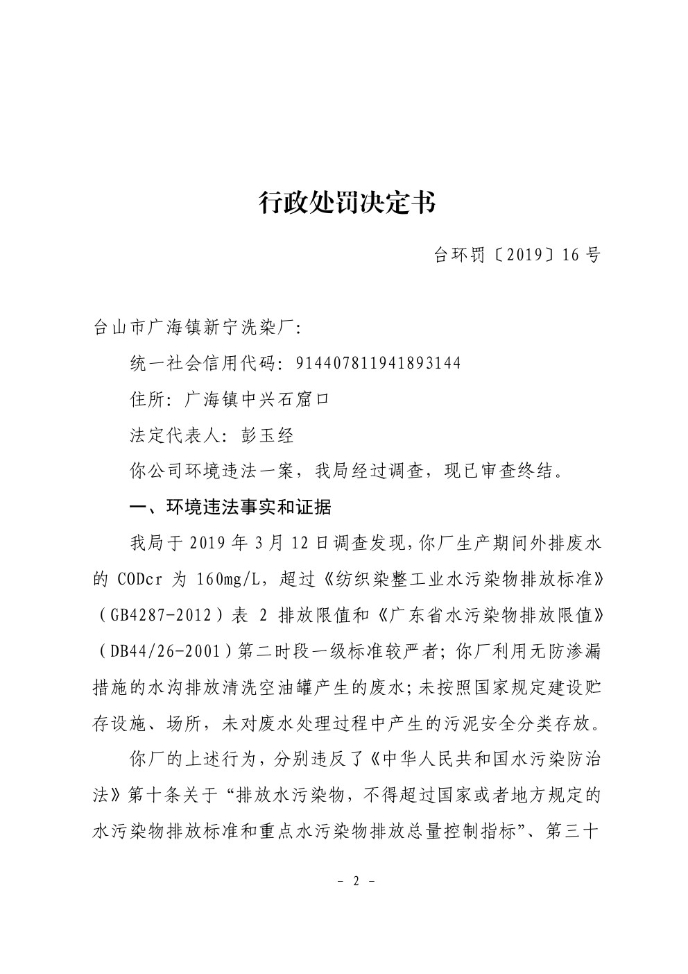 行政处罚决定书(台环罚〔2019〕16号)