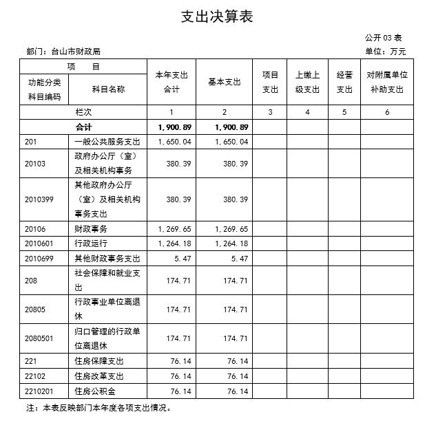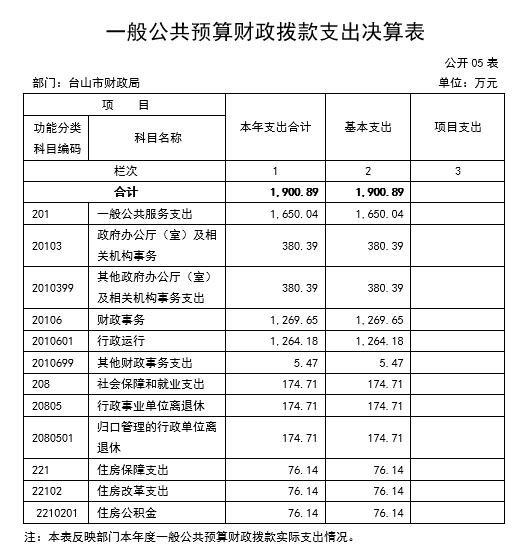 台山市财政局2015年度总支出2,005.13万元,其中本年支出1,900.89万元。具体情况如下: