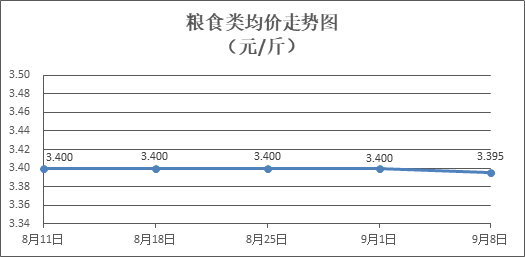 粮食类商品价格基本平稳。所监测的4种粮食类商品价格波动情况为1跌3平,零售均价为每斤3.395元,环比下降0.15%。其中:丝苗米、富强粉零售均价分别为每斤3.58元、3.37元,环比分别下降0.56%、持平。