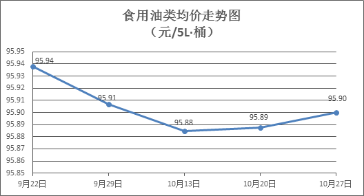 食用油类商品价格基本平稳。所监测的9种食用油(5L装)商品价格波动情况为1涨8平,综合零售均价为每桶95.90元,环比上涨0.01%。其中:金龙鱼花生油、金龙鱼调和油零售均价为每桶102.81元、71.29元,环比分别上涨0.11%、持平。