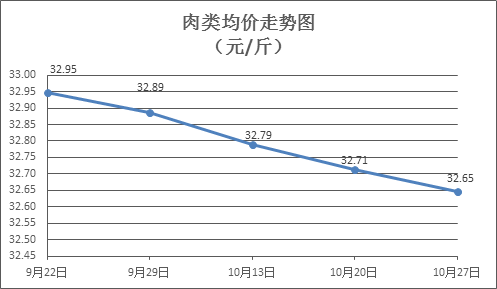 肉类商品价格持续下降。所监测的8种肉类商品价格波动情况为1涨7跌,综合零售均价为每斤32.65元,环比下降0.20%。其中:排骨、精瘦肉、牛肉、带骨羊肉零售均价分别为每斤32.28元、20.22元、45.79元、41.49元,环比分别下降0.37%、下降0.39%、上涨0.11%、下降0.07%。