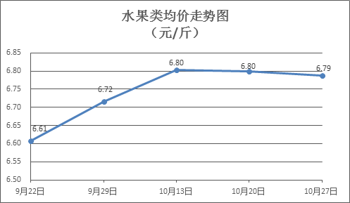 水果类商品价格微幅盘整。所监测的6种水果商品价格波动情况为2涨3跌1平,综合零售均价为每斤6.79元,环比下降0.15%。其中橙子、苹果、葡萄零售均价分别为每斤6.71元、7.45元、13.67元,环比分别下降1.18%、下降0.40%、上涨0.30%。