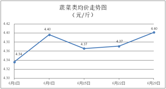 蔬菜类商品价格总体略涨。所监测的32 种蔬菜商品价格波动情况为18涨10跌4平,综合零售均价为每斤4.40元,环比上涨0.70%。其中:涨幅居前的品种包括丝瓜、黄瓜、水空心菜,零售均价分别为每斤4.76元、3.81元、3.76元,环比分别上涨9.17%、6.42%、3.01%;跌幅靠前的品种包括花菜、土豆、红萝卜,零售均价分别为每斤4.68元、2.92元、3.07元,环比分别下降2.50%、1.35%、1.29%。