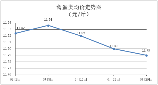 禽蛋类商品价格微幅下降。所监测的5种禽蛋类商品价格波动情况为1涨3跌1平,综合零售均价为每斤11.79元,环比下降0.08%。其中:白条鸡、白条鸭零售均价分别为每斤20.63元、15.41元,环比分别上涨0.10%、下降0.06%;鸡蛋、鸭蛋零售均价分别为每斤6.60元、7.13元,环比分别下降0.30%、下降0.56%。