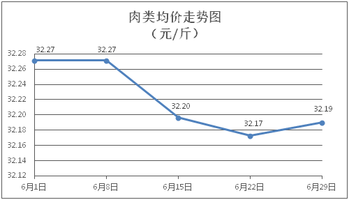 肉类商品价格微幅盘整。所监测的8种肉类商品价格波动情况为2涨4跌2平,综合零售均价为每斤32.19元,环比上涨0.05%。其中:排骨、精瘦肉、肋条肉、牛肉、带骨羊肉零售均价分别为每斤30.15元、18.95元、15.82元、46.70元、42.38元,环比分别下降0.03%、下降0.26%、下降0.06%、上涨0.49%、上涨0.05%。