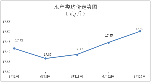水产类商品价格延续微涨。所监测的9种水产商品价格波动情况为5涨3跌1平,综合均价为每斤17.50元,环比上涨0.32%。其中:草鱼、鲫鱼、淡水鲈鱼、基围虾零售均价分别为每斤11.21元、14.18元、22.55元、30.61元,环比分别上涨0.27%、下降0.49%、上涨0.53%、下降0.29%。