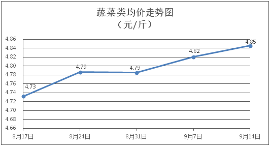 蔬菜类商品价格涨多跌少。所监测的32 种蔬菜商品价格波动情况为19涨10跌3平,综合零售均价为每斤4.85元,环比上涨0.53%。其中:涨幅居前的品种包括西洋菜、水东芥菜、莴笋,零售均价分别为每斤5.11元、4.72元、4.17元,环比分别上涨5.14%、3.28%、2.71%;跌幅靠前的品种包括丝瓜、白苋菜、青豆角,零售均价分别为每斤5.35元、4.38元、5.34元,环比分别下降3.43%、3.10%、2.38%。