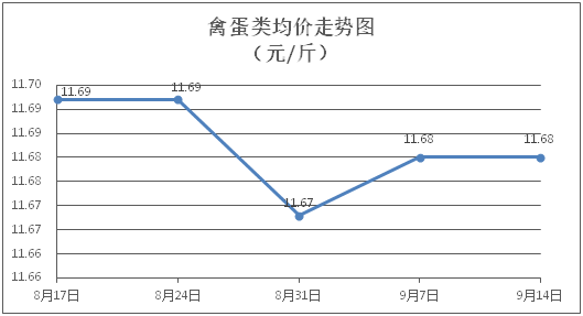 禽蛋类商品价格微幅盘整。所监测的5种禽蛋类商品价格波动情况为2涨1跌2平,综合零售均价为每斤11.68元,环比持平。其中:白条鸡、白条鸭零售均价分别为每斤20.81元、15.14元,环比分别上涨0.10%、下降0.20%;鸡蛋、鸭蛋零售均价分别为每斤6.35元、7.06元,环比分别上涨0.16%、持平。