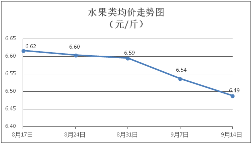 水果类商品价格小幅下降。所监测的6种水果商品价格波动情况为4跌2平,综合零售均价为每斤6.49元,环比下降0.74%。其中橙子、香蕉、葡萄零售均价分别为每斤7.15元、3.05元、12.69元,环比分别下降0.42%、下降0.33%、下降1.40%。