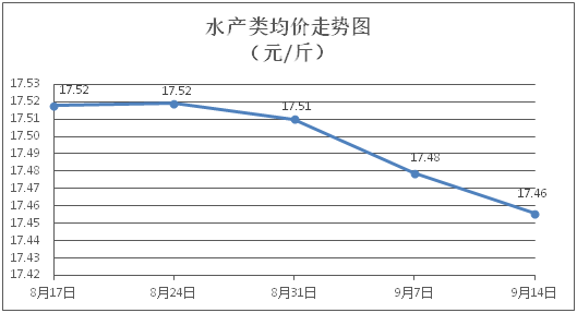 水产类商品价格总体略降。所监测的9种水产商品价格波动情况为2涨5跌2平,综合均价为每斤17.46元,环比下降0.13%。其中:草鱼、鲫鱼、罗非鱼、基围虾零售均价分别为每斤11.36元、14.32元、8.93元、29.07元,环比分别下降0.35%、持平、上涨0.11%、下降0.89%。