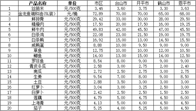 说明:1、表中价格为该地区监测点综合平均价;2、“市区”含蓬江区、江海区、新会区,价格分别采自蓬江市场、江南市场、城东市场等13家农贸市场;3、其他四个县市价格分别采自新华市场、锦江市场等8家农贸市场。