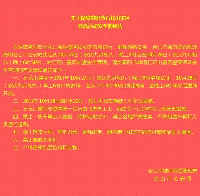 关于保障重阳节石花山景区登高活动安全的通告