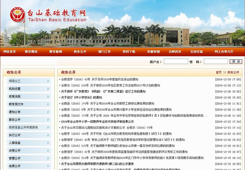 2016年,共在门户网站公开政府信息406条,教育新闻信息482条;在台山市政府信息公开目录系统公开政府信息273条。