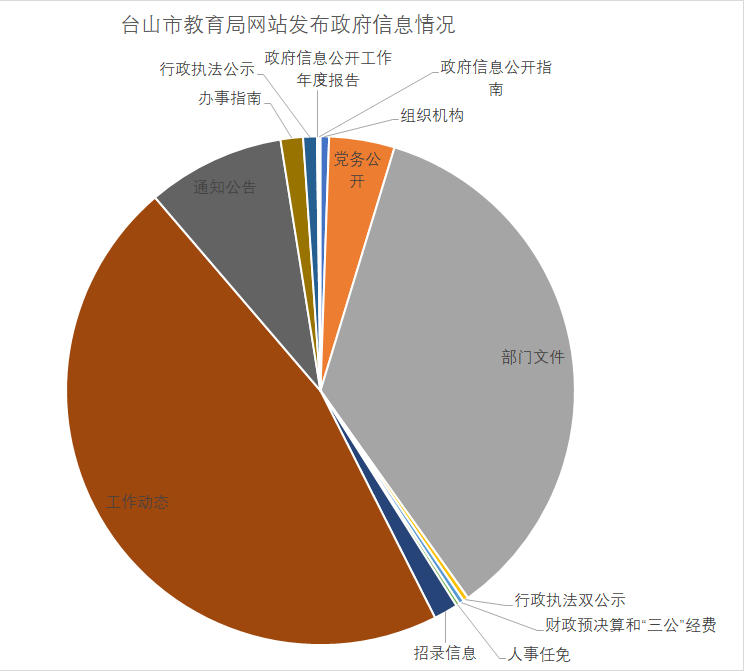 2018年,台山市教育局网站发布政府信息914条,其中组织机构类信息5条,党务公开信息38条,部门文件信息324条,行政执法双公示信息3条,财政预决算及“三公”经费信息3条,人事信息16条(其中人事任免2条,招录信息14条),工作动态类信息422条,通知公告类信息80条,办事指南类信息13条,行政执法公示信息8条,政府信息公开工作年度报告1条,政府信息公开指南1条。