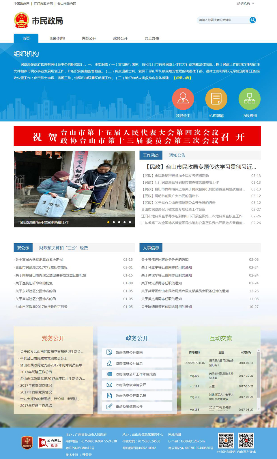 2017年,台山市民政局门户网站发布信息192条,其中部门文件类信息8条,政府信息公开年度报告类信息1条,工作动态类信息103条,人事任免类信息8条,行政许可和行政处罚“双公示”类信息56条,其他类信息16条。通过台山政府网的“重点领域信息公开”栏目公开信息68条。