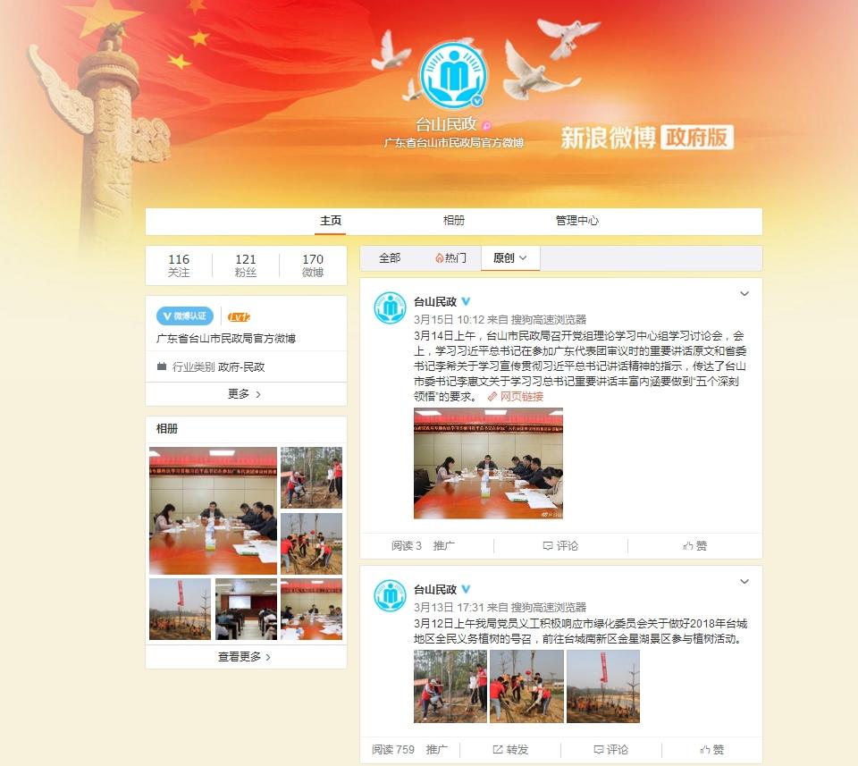 2017年,台山市民政局官方微博“台山民政”共发布信息54条;官方微信“台山民政”共发布信息140条。