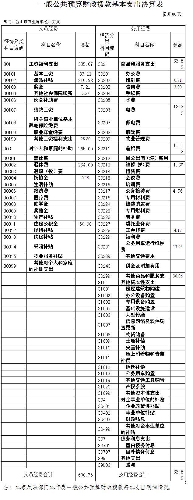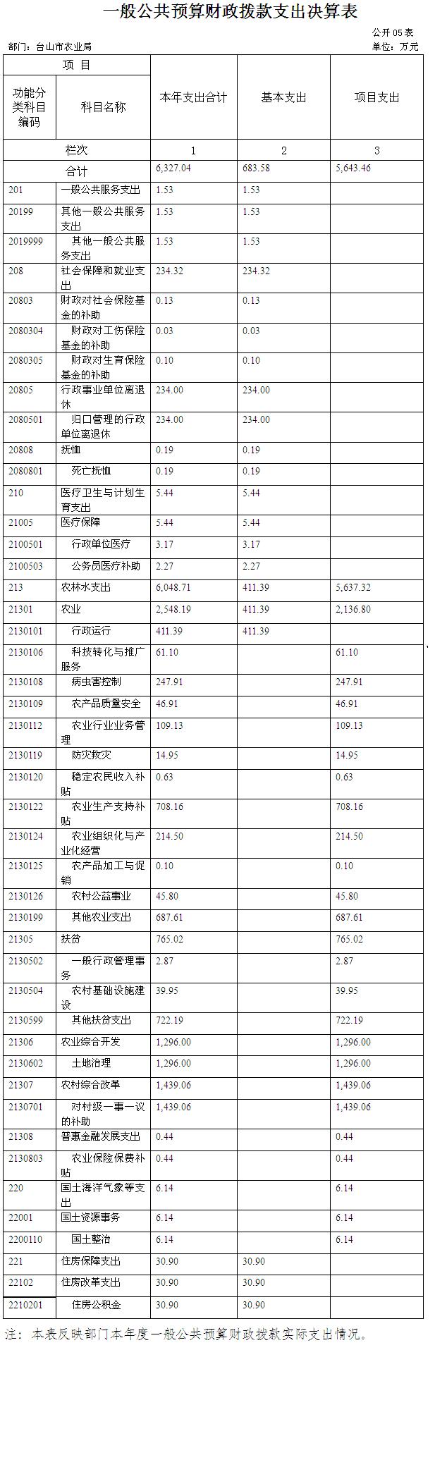 分功能科目看,一般公共服务支出(类) 其他一般公共服务支出(款) 1.53万元,主要用于其它商品服务支出;社会保障和就业支出(类)财政对社会保险基金的补助(款) 0.13万元,主要用于人员社保费,行政事业单位离退休(款)234.00万元,主要用于退休人员支出,抚恤(款) 0.19万元,主要用于死亡抚恤;医疗卫生与计划生育支出(类) 医疗保障(款) 5.44万元,主要用于在职人员社保费用;城乡社区支出(类) 国有土地使用权出让收入及对应专项债务收入安排的支出(款) 234.14,主要用于农村土地承包经营权确权登记颁证市级补助,农业土地开发资金及对应专项债务收入安排的支出(款)0.65万元,主要用于农业综合开发土地治理项目;农林水支出(类)农业(款)2548.19万元,主要用于在职人员支出及项目支出,扶贫(款) 765.02万元,主要用于扶贫项目支出,农业综合开发(款) 1296万元,主要用于农业综合开发项目支出,农村综合改革(款) 1439.06万元,主要用于对村级一事一议的补助,普惠金融发展支出(款)0.44万元,主要用于农业保险保费补贴;国土海洋气象等支出(类) 国土资源事务(款)6.14万元,主要用于高标准基本农田建设项目;住房保障支出(类) 住房改革支出(款) 30.90万元,主要用于在职人员住房公积金支出。