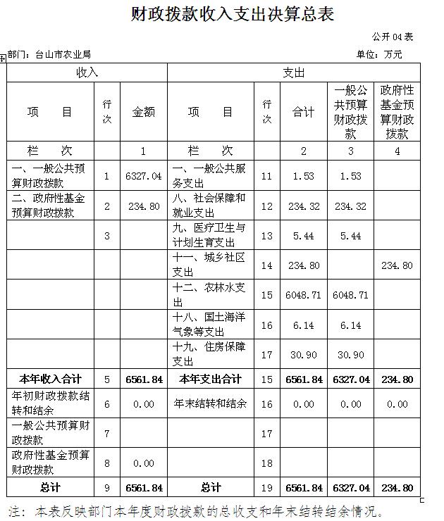 台山市农业局2016年度财政拨款收入合计6561.84万元。其中:一般公共预算财政拨款收入6327.04万元,比年初预算数增加5457.86万元,增长627.93%;主要原因是项目收入增加;政府性基金预算财政拨款收入234.8万元,比年初预算数增加4.8万元,增长2%;主要原因是项目收入增加。