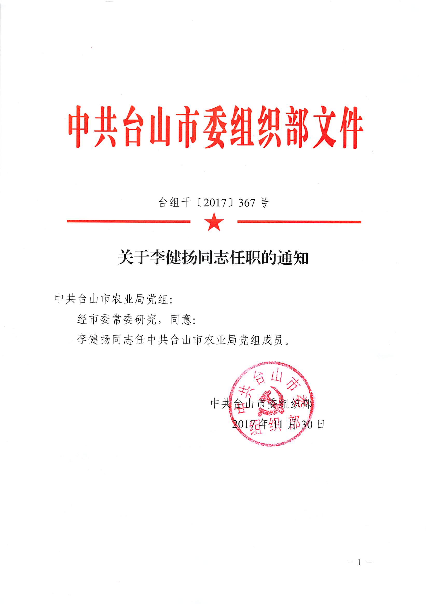 关于李健扬同志任职的通知