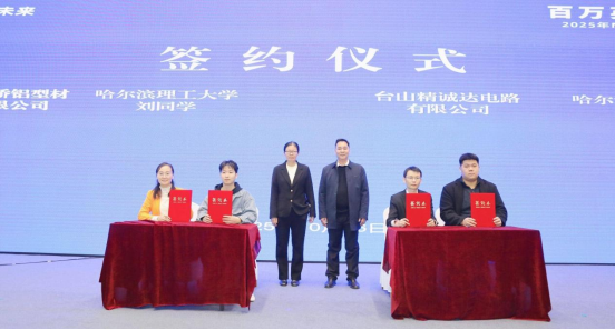 在招聘会现场上,台山亮点异彩纷呈,启动仪式上哈工大校友,台山核电党委书记、董事长刘丹作为战略性新兴产业领军企业代表发言,深情分享了自己在广东的奋斗历程,向母校学子传递来自大湾区的机遇与诚意。据统计,中广核集团在哈尔滨地区高校与103名毕业生达成就业意向,其中博士3人,硕士65人,在活动当天,与25名哈工大毕业生举办现场签约仪式,派发录取通知书。金桥铝材、精诚达也分别与高校学子达成就业意向并现场签约,人社部门为签约学子送上就业礼包。