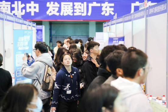求职毕业生在台山市重点企业展位前投递简历和咨询交流