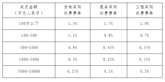 (一)收费标准:实际代理服务费=成交金额×基准收费费率×(成交折扣率),基准收费费率以《国家计委关于印发招标代理服务收费管理暂行办法的通知》(计价格〔2002〕1980号)《国家发展改革委关于降低部分建设项目收费标准规范收费行为等有关问题的通知》(发改价格〔2011〕534号)文件为标准,按差额定率累进法计算收取,即: