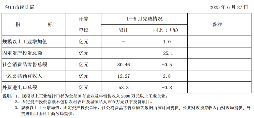 台山市2025年1-5月主要经济指标完成情况