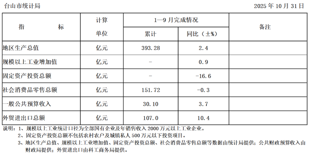 台山市2025年1-9月主要经济指标完成情况
