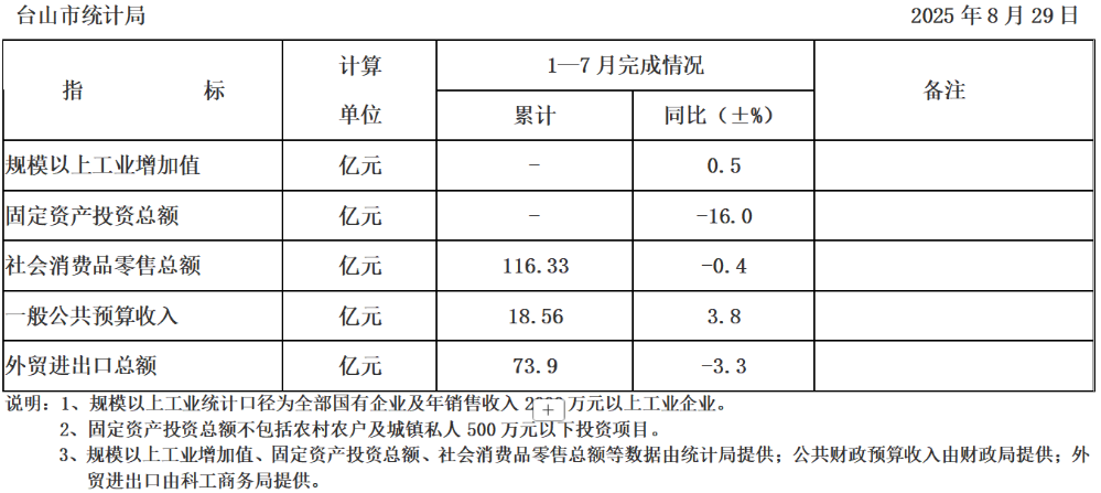 台山市2025年1-7月主要经济指标完成情况