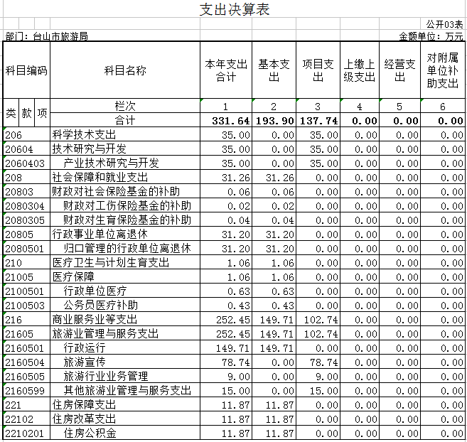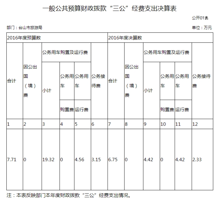 台山市旅游局2016年度财政拨款支出共6.75万元,完成预算7.71万元的87.5%。其中因公出国(境)费支出决算为0万元,完成预算0万元的100%;公务用车购置及运行维护费支出决算为4.42万元,完成预算4.56万元的96.9%;公务接待支出决算为2.33万元,完成预算3.15万元的74%。2016年“三公”经费支出决算小于预算数的主要原因是本年度认真贯彻落实中央八项规定精神和厉行节约的要求,从严控制“三公”经费开支,全年实际支出比预算有所节约。