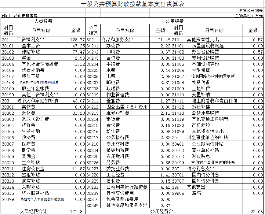 2016年财政拨款支出按用途划分,基本支出193.9万元,占58.47%,其中:工资福利支出128.77万元,比去年增加42万元;对个人和家庭的补助43.07万元,比去年增加11.33万元;商品和服务支出21.49万元,比去年增加12.18万元;其他资本性支出等支出0.57万元,比去年增加0.57万元;项目支出决算137.74万元,占41.53%,比去年增加64.74万元,本年主要支出项目有旅游产业发展资金78.74万元,旅游服务业发展十三五规划编制经费9万元,江财工〔2016〕89号旅游发展专项资金(旅游扶贫方向)15万元,江财工〔2015〕346号2016年旅游发展专项资金35万元。
