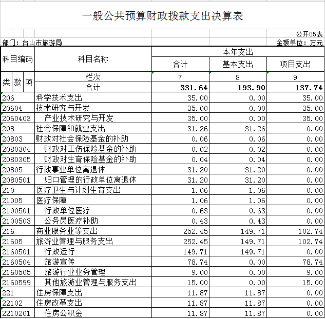 一、主要职责 台山市旅游局是台山市人民政府主管旅游业的工作部门,主要职能是: (一)贯彻执行国家有关旅游业的方针、政策、法规和规划;拟定旅游业管理的方法、规章并监督实施。 (二)拟定国际国内旅游市场开发战略,组织旅游整体形象的对外宣传和重大促销活动;制订旅游发展战略规划和计划,组织、指导重要旅游产品的开发。 (三)组织旅游资源的普查工作,指导重点旅游区域的规划开发建设;组织、指导旅游统计工作。 (四)组织实施旅游景区景点、度假区及旅游住宿、旅行社、旅游车船公司和特种旅游项目的设施标准和服务标准;负责旅行社的开办及其业务年检的报批;指导和监督旅游饭店及旅游设施的质量规范和管理工作。 (五)会同有关部门做好出国旅游,赴香港、澳门特别行政区及台湾地区旅游和边境旅游的规范、管理及协调工作;指导旅游对外交流与合作。 (六)监督、检查旅游市场秩序和服务质量,受理旅游者投诉,维护旅游者合法权益。 (七)指导旅游教育、培训工作;指导实施旅游从业人员的职业资格制度和等级制度。 (八)承办市人民政府和江门市旅游局交办的其他事项。 二、机构设置 (一)本部门无下属单位,部门预算为市局本级预算。内设三个机构,分别为:办公室、资源与市场开发股、综合管理股。