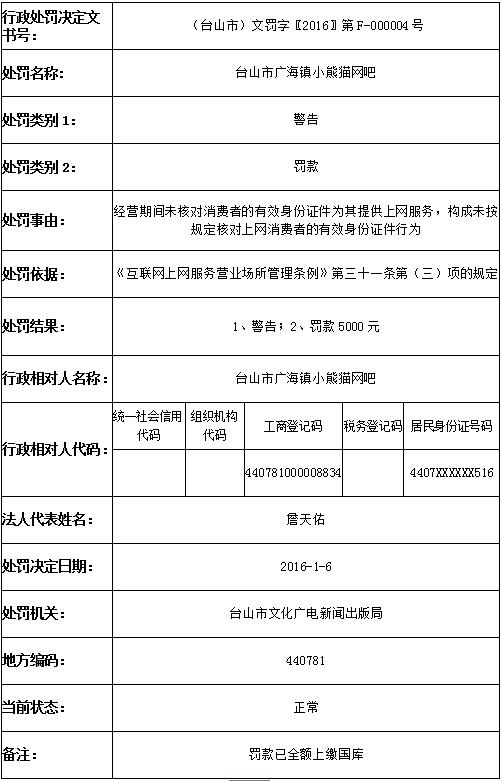 台山市广海镇小熊猫网吧未按规定核对上网消费者的有效身份证件案