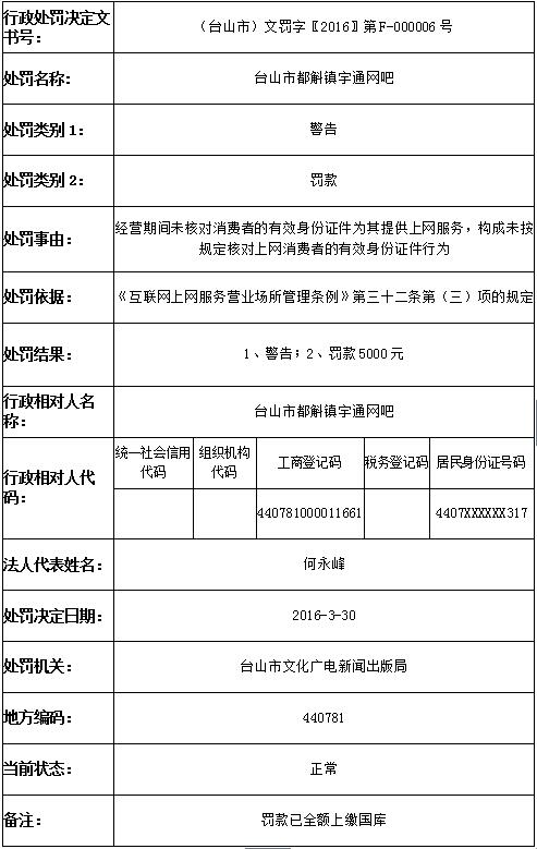台山市都斛镇宇通网吧未按规定核对上网消费者的有效身份证件案