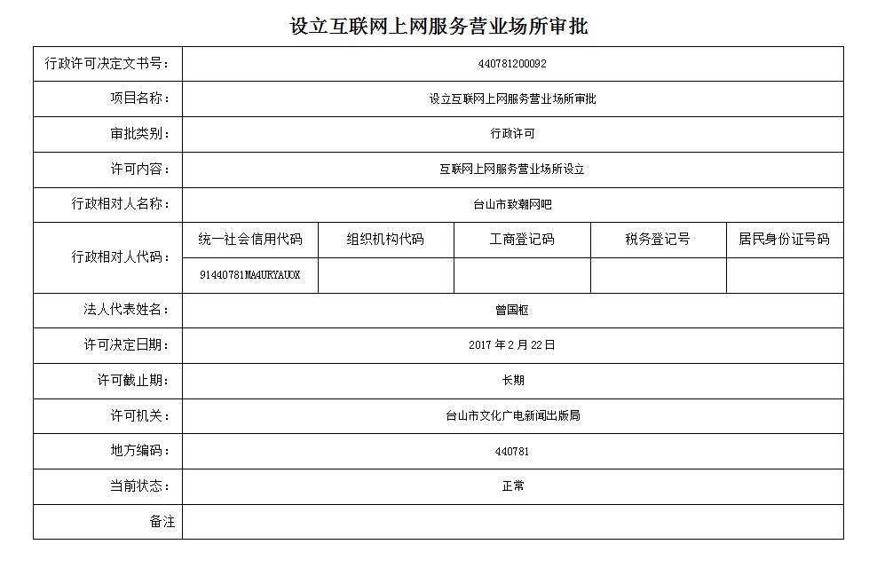 设立互联网上网服务营业场所审批(台山市致潮网吧)