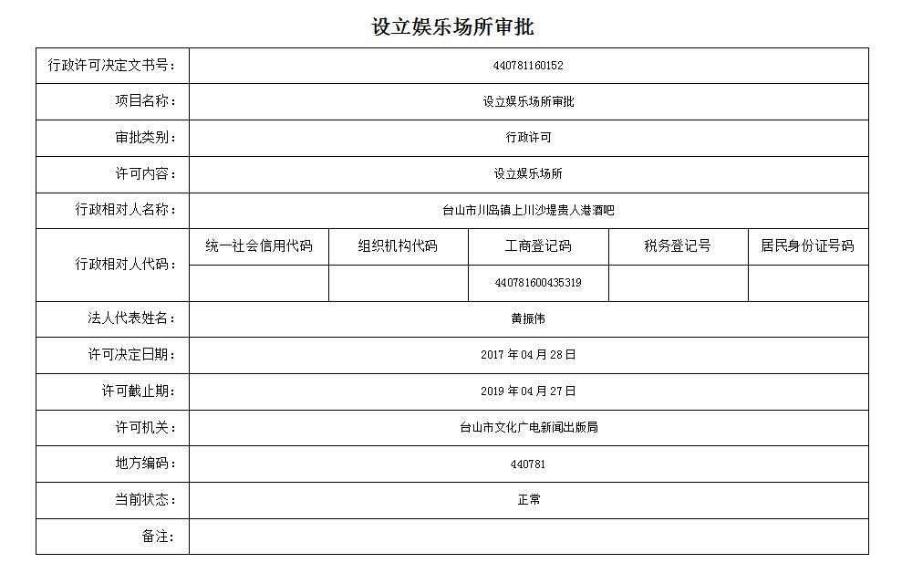设立娱乐场所审批(上川沙堤贵人港酒吧)