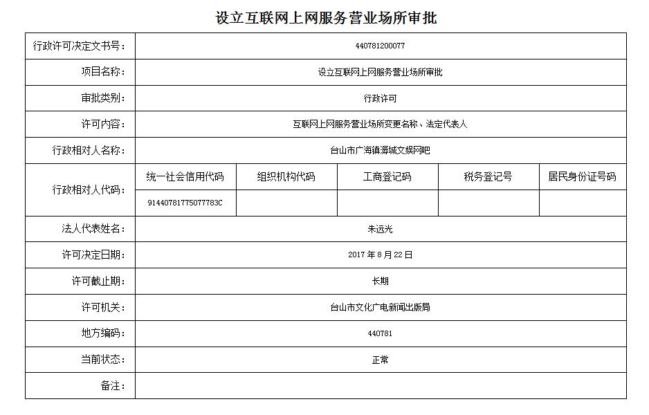 设立互联网上网服务营业场所审批(台山市广海镇溽城文娱网吧)