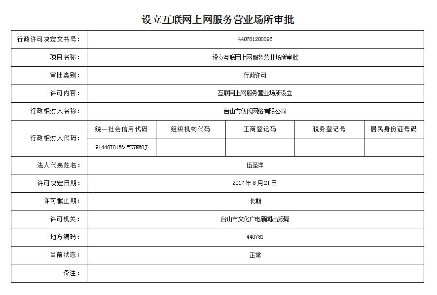 设立互联网上网服务营业场所审批(台山市伍氏网络有限公司)