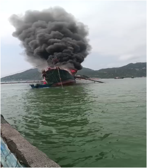 4月9日14时50分许,锚泊在台山市赤溪镇鱼塘港附近海域的一艘渔船不慎失火燃烧,浓烟滚滚,情况危急。台山海宁志愿者队员发现险情后,立即安排队员出动两艘救援艇前往事发海域协助救援,到达事发海域后,救援队员迅速将海上的渔民转移到救援艇,并将其安全送回岸上。随后,救援队员继续返回事发现场巡逻警戒,协助市海上搜救中心和江门市海域综合执法支队台山大队开展救援。