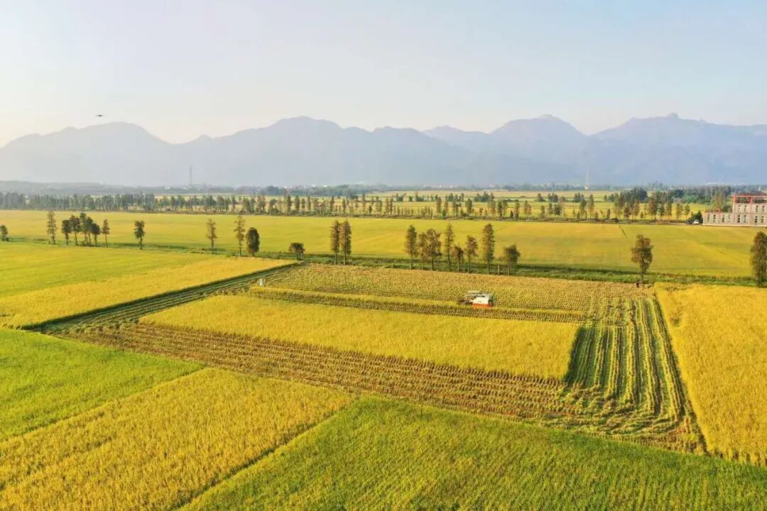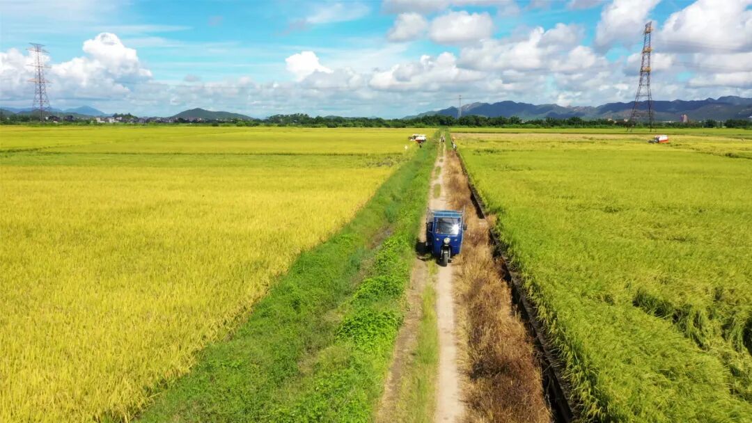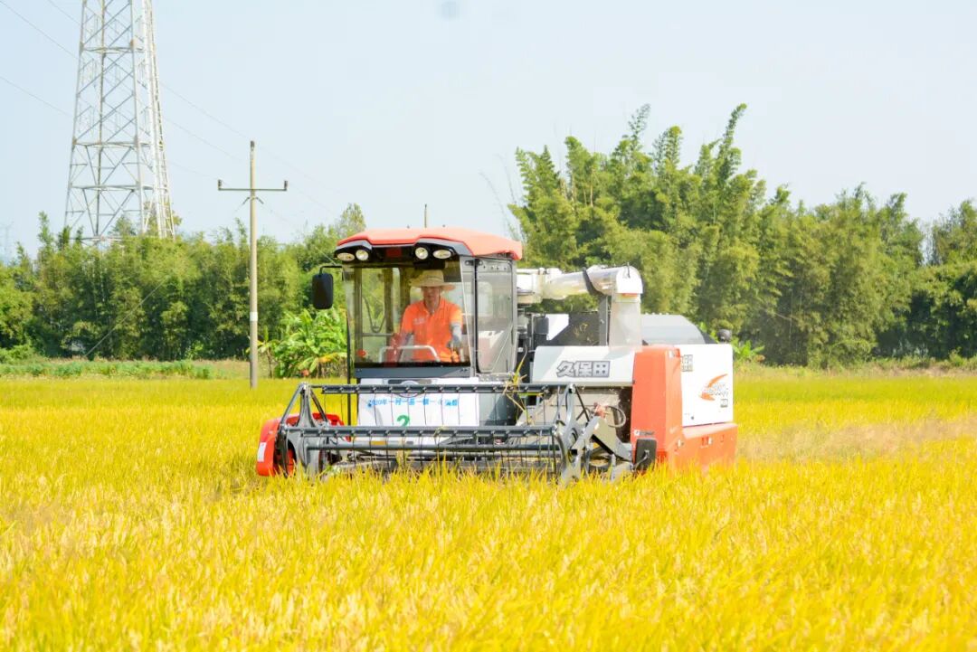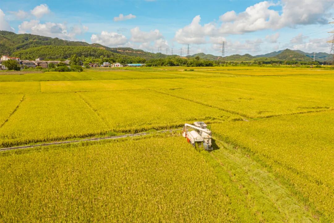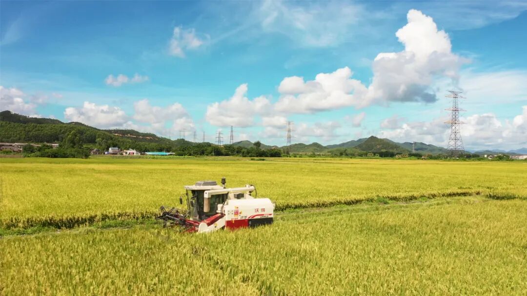 广袤的田野里一派繁忙热闹的景象,到处是人们辛勤劳作的身影。收割机、打禾机、小推车等往来穿梭于田间,井然有序。