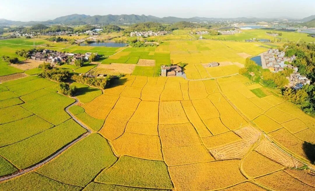 阳光洒在大地上,金黄色的稻田似乎披上了一层“薄纱”,如诗如画 ,美不胜收。从空中俯瞰,稻田被无数田埂分割成方方块块,有浅绿的、金黄的,与周围葱茏的树木形成美丽的乡村之景。