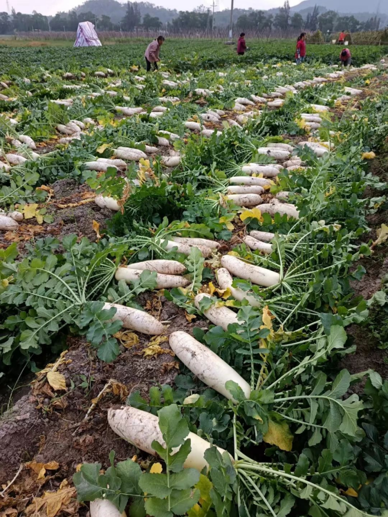 在白沙镇潮境村委会虎山村的一片山坡地上,今年70多岁的黄耀新,已经在这里种植潮境萝卜几十年,如今他的儿子也子承父业,学习种植潮境萝卜的技术。据了解,潮境萝卜一般是在冬至前70多天开始种植,从育苗、移植到收成,关键在于幼苗时的施肥和种植期的淋水等环节。水肥的控制直接影响到萝卜的长势,技术掌握不好就容易导致萝卜空芯、表皮开裂,影响销售。今年由于雨水少、整体天气偏暖,黄耀新种植的8亩多萝卜长势良好,单个个头平均都有6-7斤,最重的一个萝卜有10斤左右。今年潮境萝卜的收购价格维持在每斤2元左右,预计黄耀新种植的潮境萝卜有6万多斤。为了助农销售,村委会也利用强村公司积极联系各地采购商和台山大型商超对接销售。