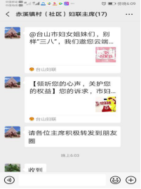 从2月份起,镇妇联发动镇村两级妇女干部转发“台山妇联”微信公众号开展的系列优秀女性典型选树宣传活动。据不完全统计,赤溪镇参与该项活动的妇女数达110人,累计转发约1000条信息,增加群众对优秀女性的知晓率,以此表达心底的敬意。同时积极挖掘我镇在这次抗疫过程中优秀的妇女代表:护岭村妇联主席傅伟芳在抗疫期间主动与丈夫组成夫妻档在检查点值班;赤溪医院黄东菊从年前一直坚守在医院发热诊治岗位,耐心为发热病人筛查和诊治工作;镇妇女代表李丽媚捐赠2.3万元用于采购一线防控物资等,在疫情防控期间她们在不同岗位上发挥着半边天的力量。