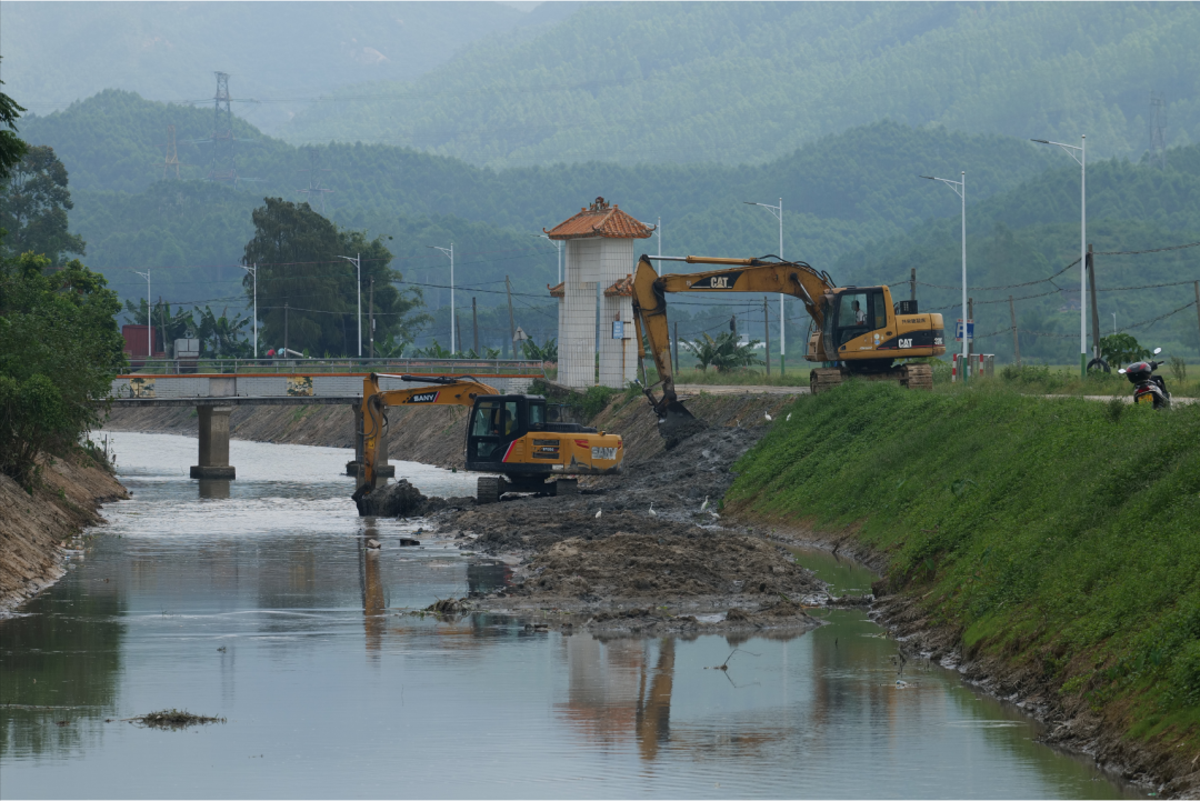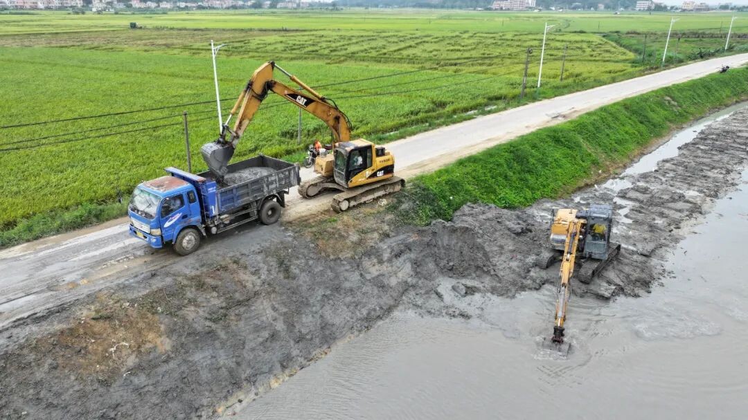 在赤溪镇黄水坑疏河工程中段,挖掘机、运输车辆正在河岸来回穿梭作业,一铲铲淤泥从河底瞬间转移到了河岸,原本淤塞的河道渐渐变得通畅,杂乱的河岸线变得整洁,一幅“河畅、水清、岸绿、景美、宜居”的美丽画卷正徐徐展开。