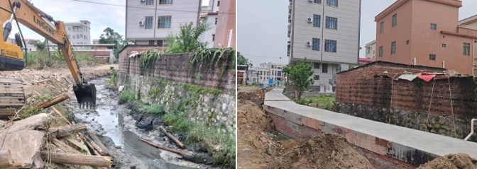 聚焦村内沟渠淤积、黑臭水体及蚊虫孳生地等问题,北门村按照“由点及面,全域覆盖”的整治思路,有序推进辖区内河道清理工作。通过组建专业队伍,配备挖掘机、抽水泵等设备,对4条总长165米的主干沟渠疏浚,清理淤泥杂物共100吨。同步明渠暗改沟渠150米,从“明渠”到“暗渠”,一字之变却让困扰村民多年的问题得到解决,为村民带来实实在在的生活品质的提升。“以前这里排污水,熏臭满天,现在改为暗渠了,下水道口堵塞、黑臭的现象得到了很好的改善。”赤溪镇北门康年新村的群众赞不绝口。