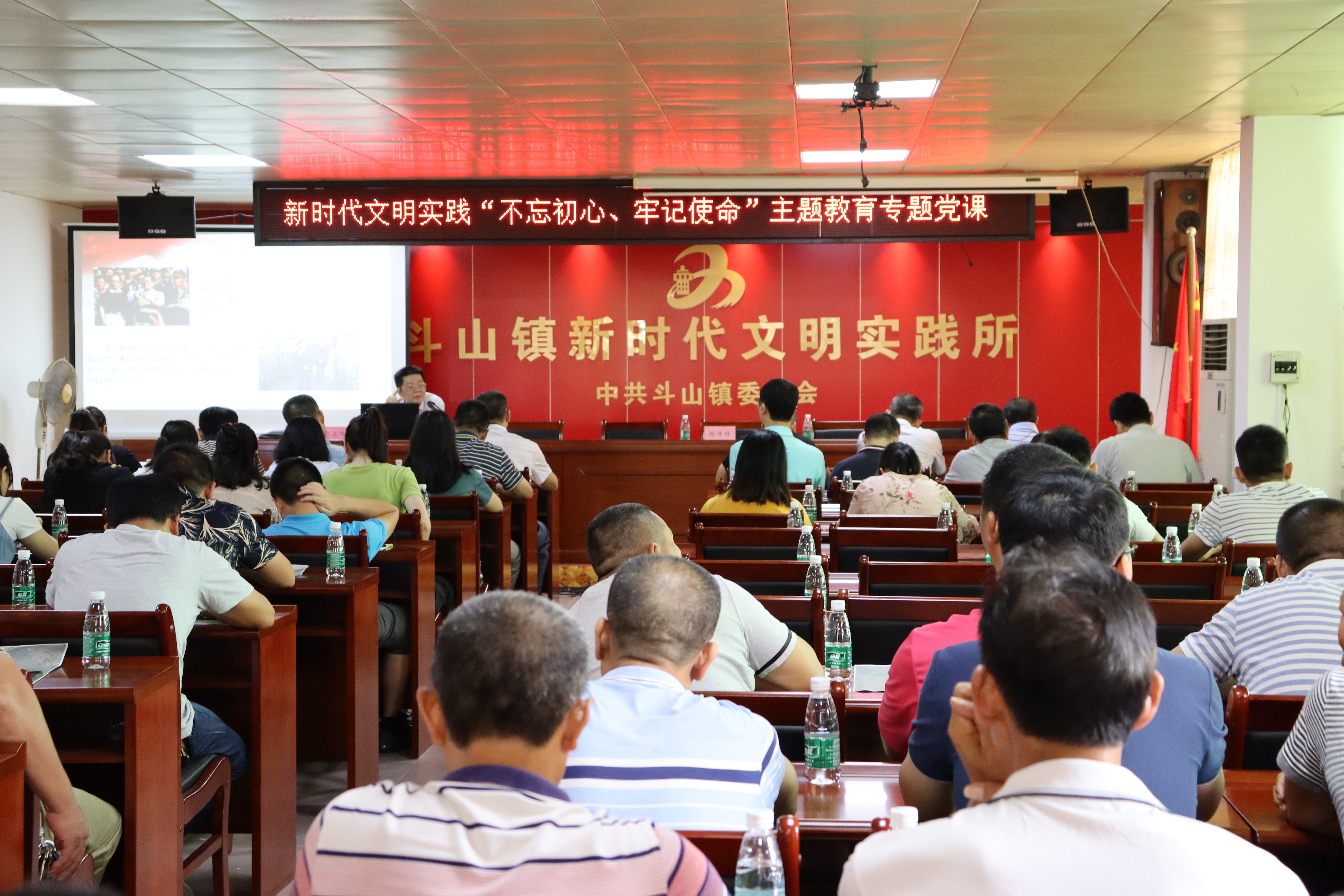 为贯彻落实习近平总书记在“不忘初心、牢记使命”主题教育工作会议上的重要讲话和上级“不忘初心、牢记使命”主题教育工作要求,近日,斗山镇在镇新时代文明实践所召开了新时代文明实践“不忘初心、牢记使命”主题教育专题党课,斗山镇全体党政领导班子成员、斗山镇新时代文明实践志愿服务团队成员、各村(居)新时代文明实践站负责同志等70多人参加了这次专题党课。